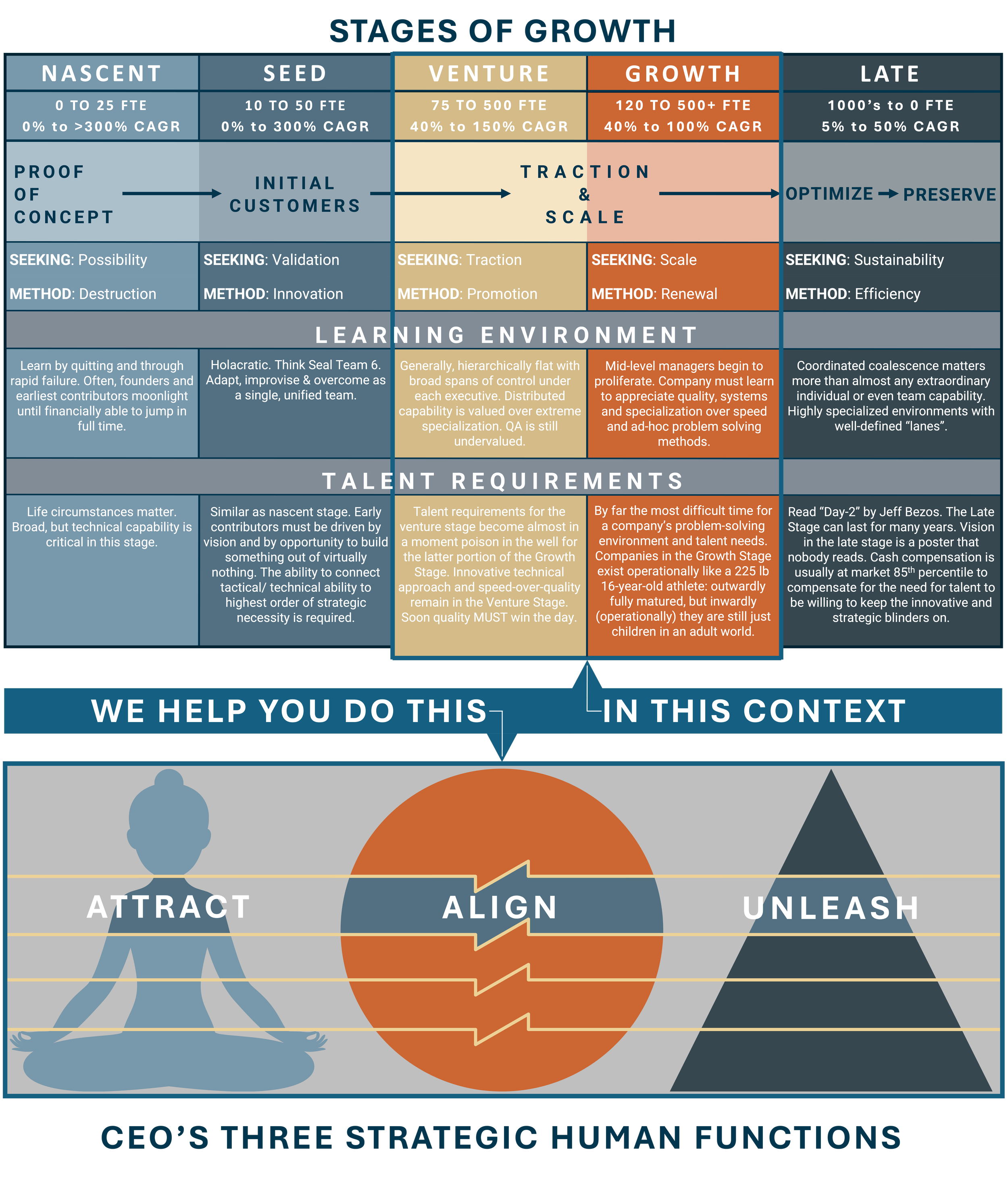 The Venture and Growth Stages are especially challenging because they are environments where velocity and size create rapid change and complexity.